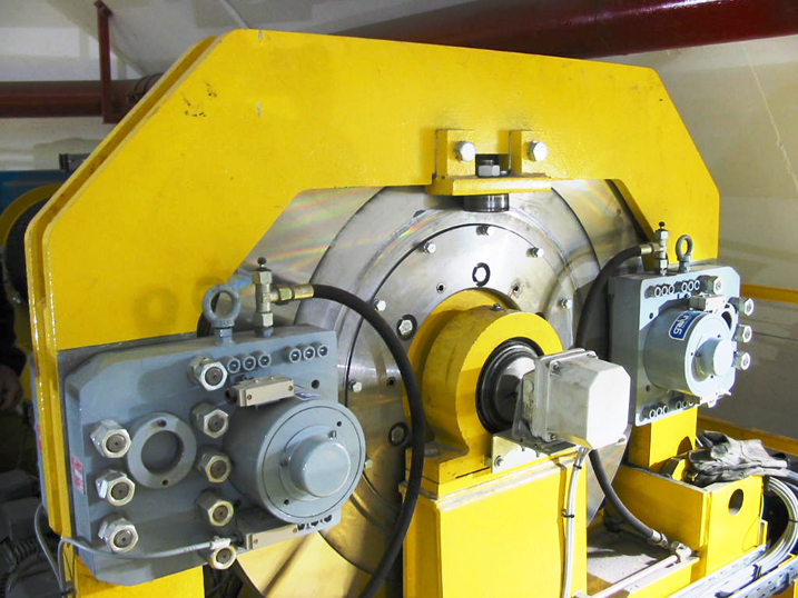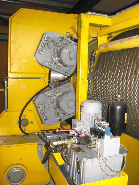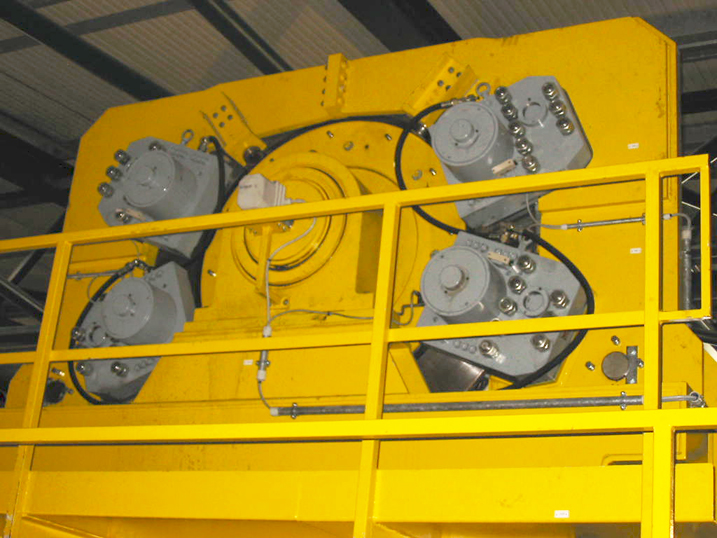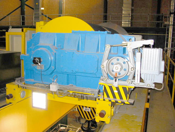 foto 5 : argano portata 140 ton (visibile anche in prima di copertina di Hoist nr. 54) con quadrupla Pinza freno GALVI di emergenza PE4 (Forza Frenante totale 1.080.000 N)