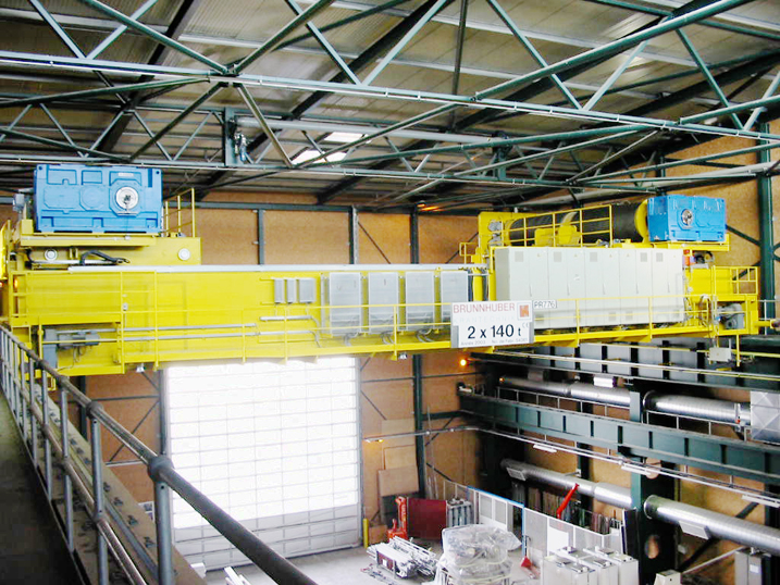 foto 4 : gru a ponte portata 2 x 140 ton (visibile anche in prima di copertina di Hoist nr. 54) con otto Pinze freno GALVI PE4, due Unità idrauliche GALVI EMEHYD e due Freni a Ceppi GALVI NV.400.HYD.080/06